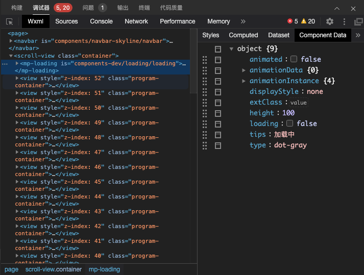 wxml 面板中可以查看自定义组件在渲染时的 Data 数据。 在 wxml 中先选中需要查看的自定义组件,然后切换到 Component Data 即可实时查看当前自定义组件的数据。